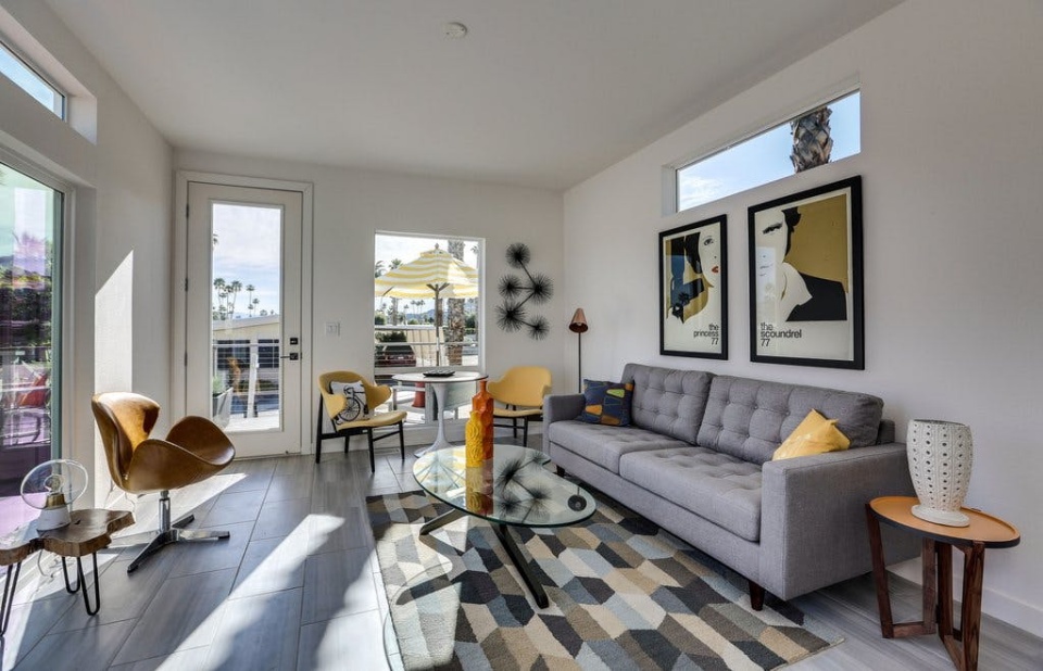 Phòng khách đẹp theo phong cách cổ điển với ghế sofa màu ghi, bàn trà gỗ thiết kế góc cạnh độc đáo. Thêm chút nhấn há cho không gian nhỏ từ thảm trải sàn và tranh treo tường với hoạ tiết, hình vẽ lạ mắt.