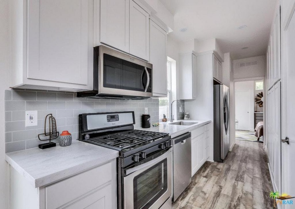 Tiếp nối với phòng khách là bếp nấu được ưu tiên chọn lựa gam màu trắng làm màu nền. Những gam màu trung tính như màu gỗ của sàn, màu bạc của đồ dùng và màu ghi xám của gạch ốp tường làm tăng vẻ đẹp cuốn hút và hiện đại cho không gian nhưng vẫn giữ được sự đơn giản và gọn gàng cần thiết.