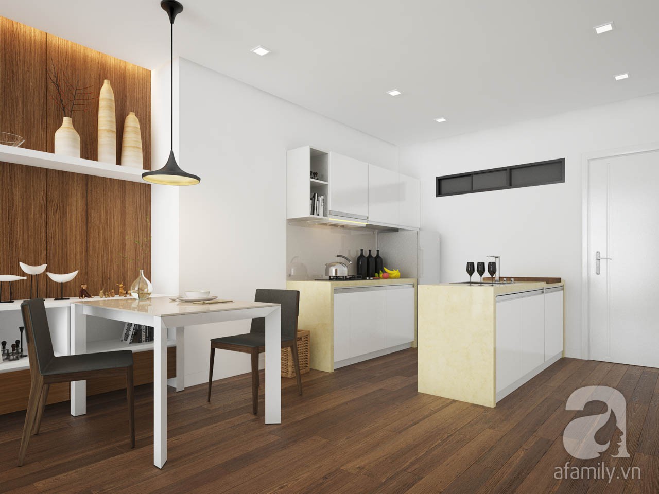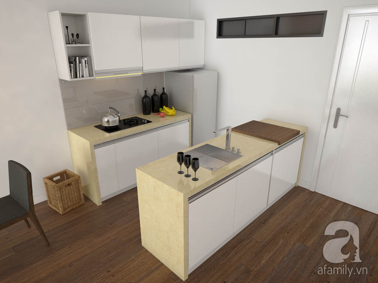 Căn hộ của bạn có không gian chia rất đẹp, KTS sẽ gợi ý cho bạn một số ý tưởng để bố trí nội thất sao cho hài hòa và tiết kiệm được không gian nhất có thể. Bước vào căn hộ sẽ là không gian bếp đầu tiên. Khu vực này có diện tích khiêm tốn, có thể thấy chúng tôi xử lý để tủ giày kẹp cùng bàn đá của hệ bếp rửa, rất tiết kiệm diện tích và không tốn chỗ đi lại. Hệ tủ bếp được chia làm 2 hệ, 1 hệ để tủ lạnh và bếp nấu, hệ còn lại để bồn rửa và tủ giày thấp, công năng được bố trí gọn gàng và ngăn nắp.