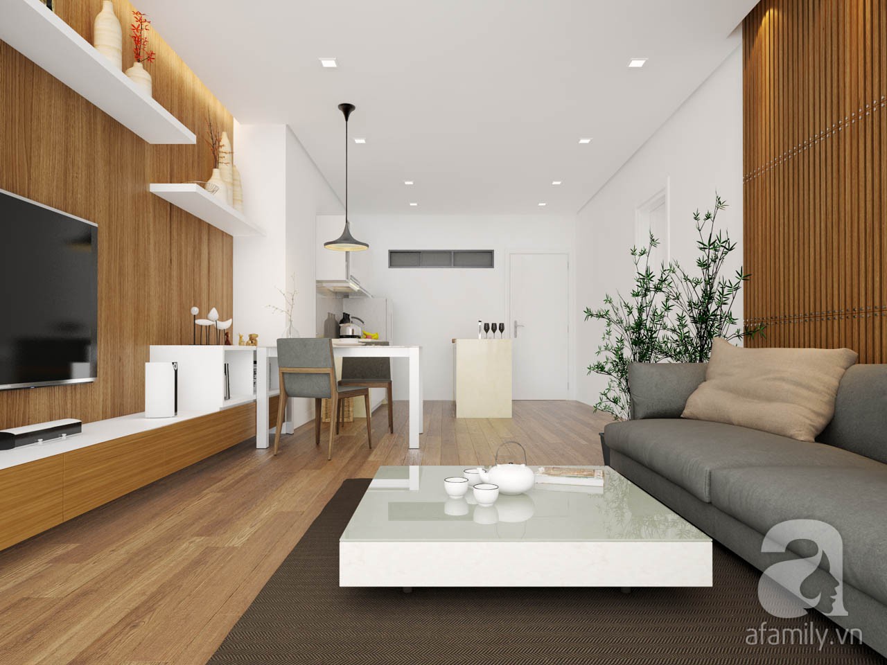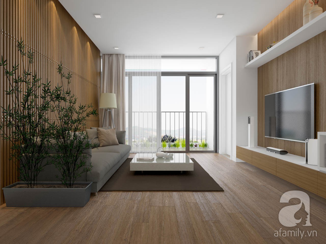 Vào phía trong cùng gần ban công nhất là phòng khách, khu vực này bố trí đồ nội thất tone màu sáng kết hợp màu gỗ sồi sẽ tạo cảm giác cho căn hộ rộng rãi hơn. Sử dụng ghế sofa chữ I tone màu ghi sáng kết hợp bàn trà vuông màu trắng sẽ tiết kiệm diện tích mà vẫn sang trọng, hài hòa. Hệ tủ tivi được bố trí đơn giản như tủ tivi và kệ để đồ décor. Không gian phòng khách được ưu ái nhất vì được bố trí gần ban công, đón nhận được nhiều ánh sáng tự nhiên nhất.