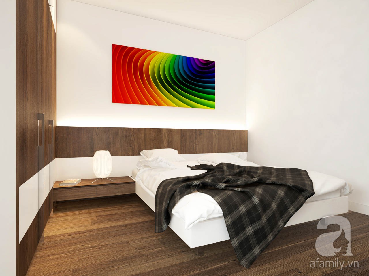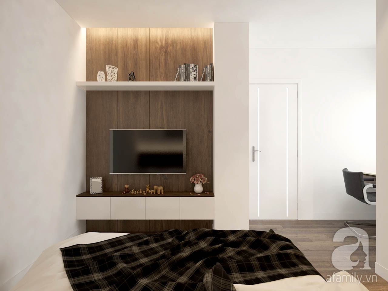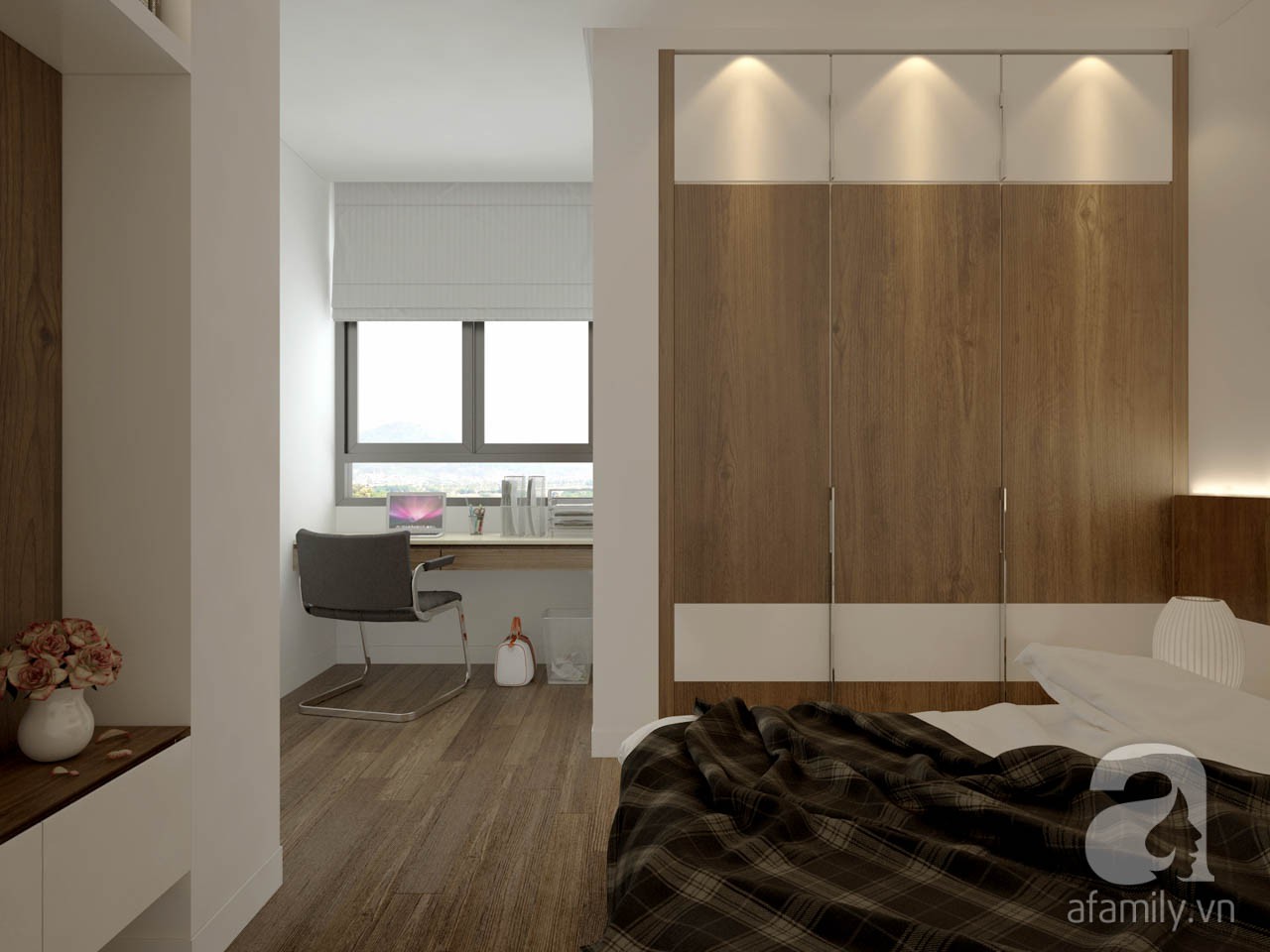 Không gian còn lại là phòng ngủ và WC. WC được bố trí bên trái từ cửa chính vào, còn phòng ngủ thì nằm phía bên phải. Phòng ngủ được bố trí đầy đủ công năng như giường, tủ quần áo, bàn làm việc, kệ giá sách, kệ tivi, táp đầu giường. khu vực bàn làm việc được bố trí sát cửa sổ để lấy ánh sáng tự nhiên.