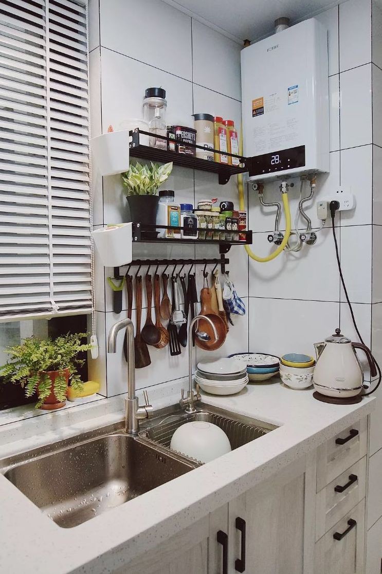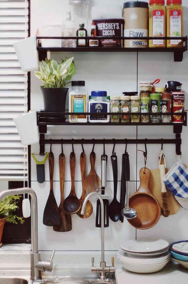 Trên tường phòng bếp còn được bố trí thêm kệ và thanh inox tiện dụng để đặt những lọ gia vị, những dụng cụ nấu bếp giúp việc lựa chọn sử dụng đồ được nhanh gọn, dễ dàng.